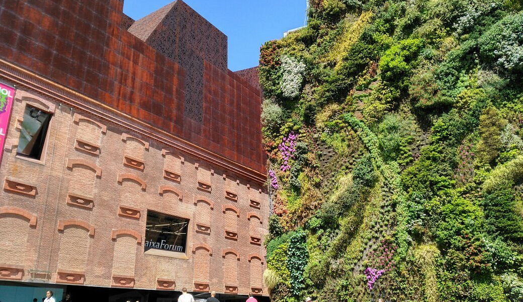 Justo al lado de la entrada, se encuentra otra pieza de sofisticación técnica y ecológica: el Jardín Vertical diseñado por Patrick Blanc. Con más de 600 metros cuadrados y miles de plantas de distintas especies, es un tapiz vivo que suaviza la dureza del entorno industrial. Es el contraste perfecto: la rigidez del ladrillo frente a la fluidez de la naturaleza vertical.